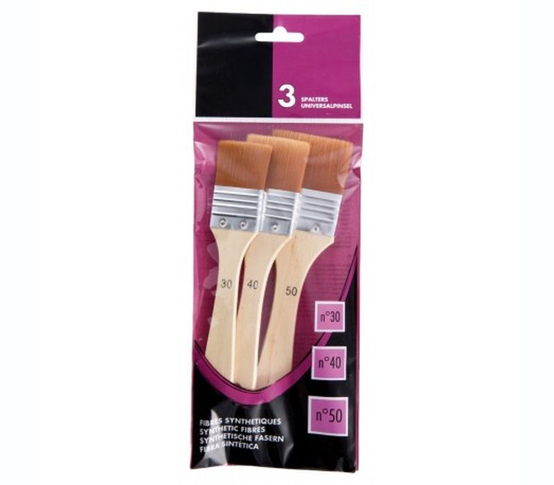 Juego de paletinas de pelo sintético de color dorado de 30mm, 40m y 50mm de ancho. Apropiada para fondos y en general cuando se necesita un acabado muy fino. Se puede usar con óleo, acrílico y acuarela.
